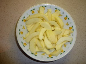 - Sbucciare e tagliare le mele a fettine sottili e lasciarle riposare con il succo di limone.
