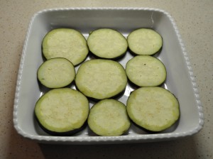 - Tagliare la melanzana a rondelle spesse circa mezzo centrimetro e disporle in una teglia da forno in modo tale che non si sovrappongano.
