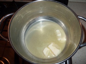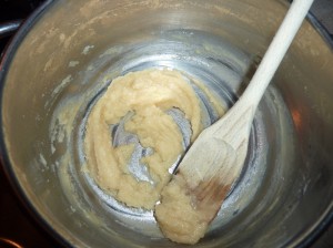 - Spegnere il fuoco e aggiungere la farina mescolando bene, poca alla volta. Rimettere subito sul fuoco e cuocere per un paio di minuti senza mai fermarsi di mescolare.