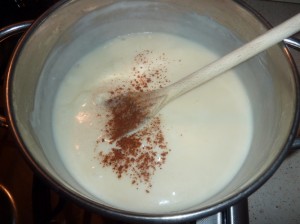 - Spegnere di nuovo la fiamma, aggiungere il latte lentamente e mescolando bene. Rimettere infine sul fuoco, cuocendo continuando a mescolare, finchè non raggiuge il bollore. Aggiungere mezzo cucchiaio di sale e la noce moscata.