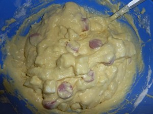 - Tagliare il formaggio e i wurstel a pezzetti ed incorporarli all’impasto.