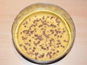 - Adagiarlo nella teglia tenendo da parte l’impasto in eccesso e sistemarlo bene lasciando i bordi rialzati. Distribuire nel fondo qualche piccola scaglia di cioccolato.