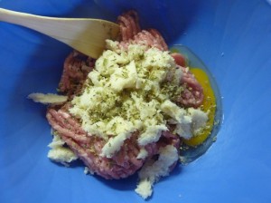 - In una ciotola unire la carne con un uovo e mezzo (l’altra metà servirà poi), pane, origano, sale, pepe.