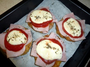 - Aggiungere su ognuno un pò di prosciutto, un cucchiaio di conserva di pomodoro ed una fetta di mozzarella, ed una spolverata leggera di origano, sale e pepe.