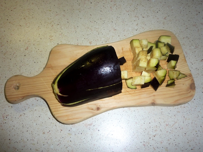 - Tagliare le melanzane a piccoli cubetti.