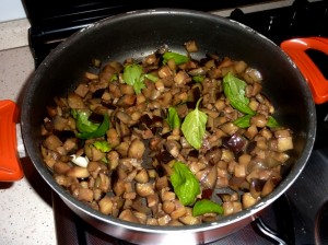 - Cuocerle in padella fino a che non saranno belle scure e morbide, poi lasciarle raffreddare una decina di minuti insieme al basilico e all’aglio.
