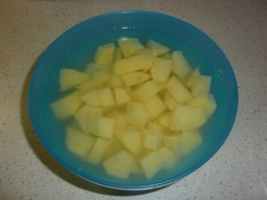 - Tagliare a fette le patate e lasciale riposare nell’acqua per almeno un’ora (se avete fretta, potete anche saltare questa parte; saranno comunque ottime).