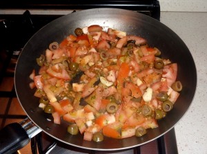 - Scaldare in una padella l’olio con lo spicchio di aglio, poi aggiungere i pomodori tagliati a piccole fettine e le olive a rondelle.