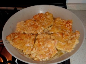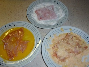 - Passare le fette di carne da entrambi i lati in tre piccoli piatti con farina, uovo sbattuto, e infine un misto di pan grattato e scaglie di mandorle.