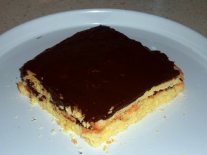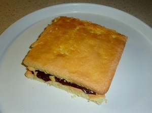 - Tagliare l’impasto formando due strati, bagnarli con il latte e farcirli con la crema di cioccolato.