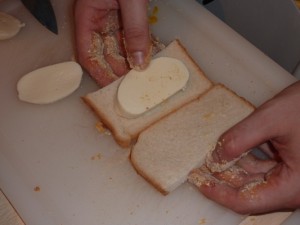 - Tagliare a metà le fette di pan carrè, tagliare a fette spesse la mozzarella e fare un panino.