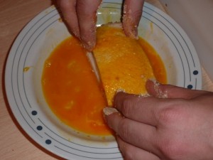 - Intingere nel latte, nell’uovo leggermente sbattuto insieme ad un po’ di sale e poi passare nel pan grattato, avendo cura di chiudere bene gli angoli.