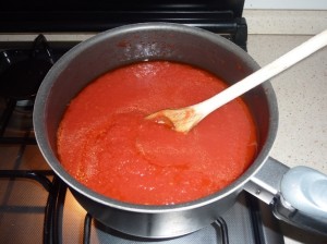 - Nel frattempo scaldare per una mezz’ora il pomodoro insieme a qualche foglia di basilico fresco, un po’ di olio e due spicchi di aglio (da togliere alla fine).