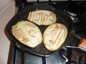 - Grigliare le melanzane da entrambi i lati finchè non sono tenere (in alternativa si possono friggere oppure cuocere in forno).
