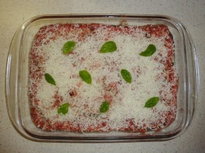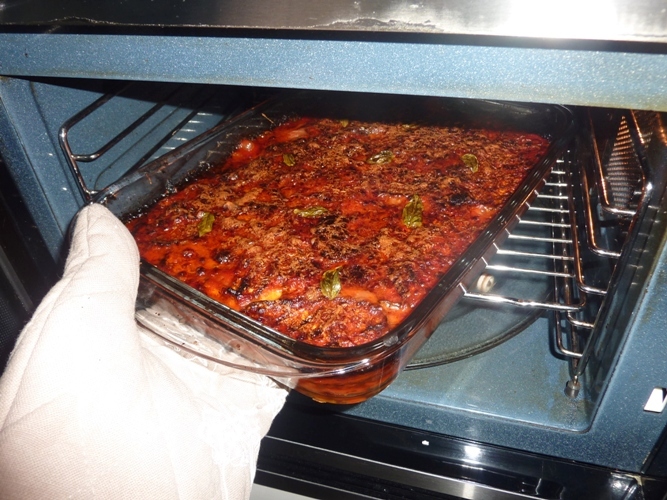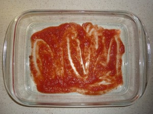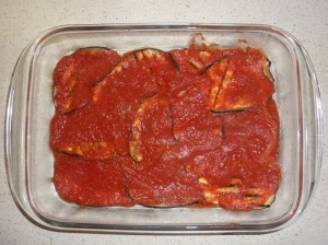 - Versare in una teglia da forno un poco di conserva sul fondo e poi partire con gli strati: