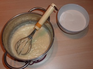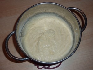- Ammorbidire il burro in una casseruola a bagno maria finchè diventa leggermente morbido e lavorabile con una frusta, poi aggiungere lo zucchero, la bustina di vanillina in polvere e l’albume.