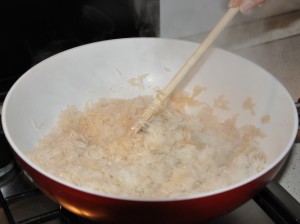 - In una pentola versare l’acqua con il riso, aggiungere il sale e cuocere mescolando bene finchè il riso non avrà assorbito tutta l’acqua.
