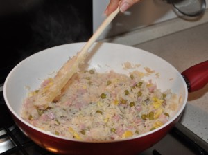 - Aggiungere i piselli, il prosciutto, la frittatina sbriciolata e mescolare bene per un paio di minuti.