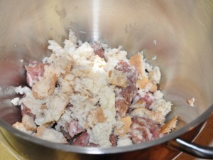 - Aggiungere la fetta di pancarrè ammollata nel latte a piccolo pezzetti e mescolare bene.