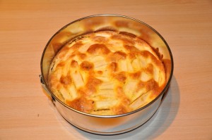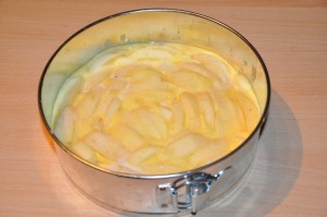 - Versare l’impasto in una tortiera apribile (io ho anche foderato il fondo con la carta da forno) e poi affondarci le mele.