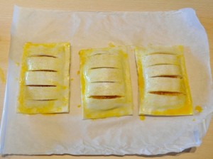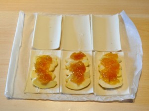 - Tagliare la sfoglia il piccoli rettangolini e farcirne metà con la mela tagliata a piccole fettine.