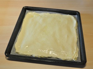 - Lasciare riposare l’impasto fuori dal frigo per un’ora prima di impastarlo delicatamente e stenderlo in una teglia ricoperta da carta da forno, con l’aiuto di un cucchiaio bagnato con poco olio.