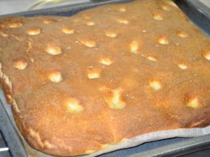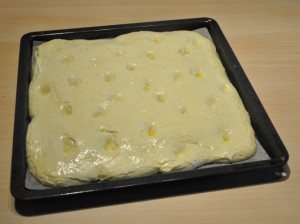 - Lasciar lievitare per tutta la giornata a temperatura ambiente e, verso ora di cena, preriscaldare il forno a 220 gradi, bucare la focaccia con le dita e spalmarla con un poco di olio e acqua.