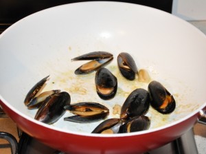 - Lavare molto bene le cozze e cuocerle in padella con poco olio e uno spicchio di aglio finchè non si aprono bene.
