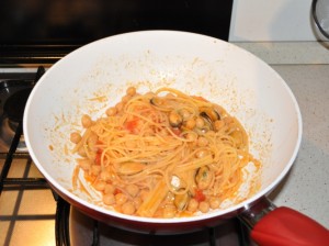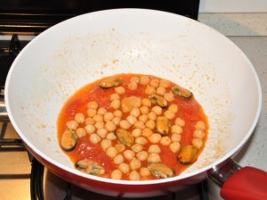 - Quando le cozze sono pronte, toglierle dal fuoco, scaldare i ceci con poco olio poi aggiungere l’interno delle cozze e la salsa di pomodoro.