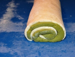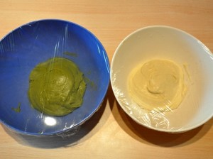 - Prima ancora che l’impasto prenda corpo, prelevarne poco meno di metà a cui aggiungere la polvere di tè matcha.
