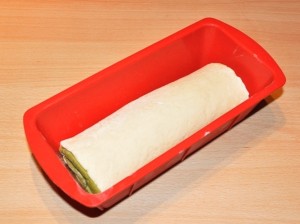 - Arrotolarlo delicatamente, poi adagiare il tutto in uno stampo da plum cake di silicone oppure in uno stampo imburrato e infarinato.