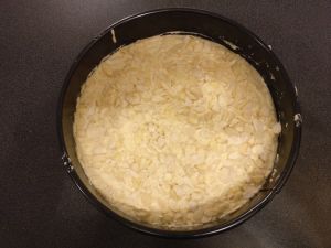 Versare in uno stampo apribile ricoperto con la carta da forno, e spoverare con le lamelle di mandorle.
