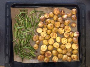 Quando le patate sono quasi pronte, aggiungere gli asparagi alla teglia e rimettere in forno per altri 10 minuti.