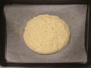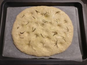 Fare qualche buco con le dita e spennellare con olio, poco sale in scaglie e rosmarino.