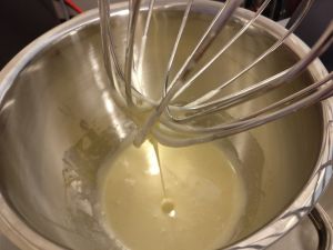 Sempre continuando a montare, aggiungere uno alla volta gli ingredienti rimasti, tenendo per ultimi la farina setacciata con il lievito e il sale.