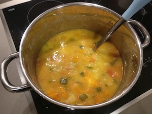 Per risparmiare tempo, invece di tagliare tutte le verdure all’inizio e poi metterle dentro in base ai tempi di cottura, sono meno rigida sui tempi di cottura e le inserisco man mano che ho finito di tagliarle.