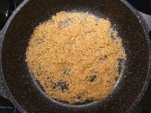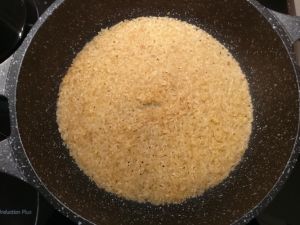 Nel frattempo, scaldare il burro in una padella capiente. Distribuirlo uniformemente sul fondo e aggiungere il riso.
