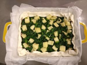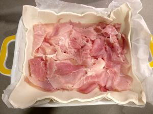Nel frattempo, disporre la pasta sfoglia in una teglia e mettere il prosciutto cotto sul fondo.