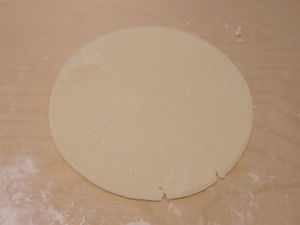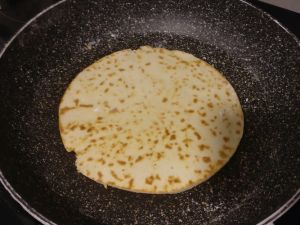 Stendere ogni pallina con il mattarello infarinato, su una base anch’essa leggermente infarinata, fino a formare un cerchio (rispetto alle piadine con glutine, risulta molto difficile ottenere una forma regolare, per questo le ho rifilate appoggiando un piatto e tagliando i bordi con un coltello).