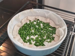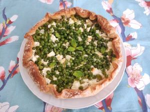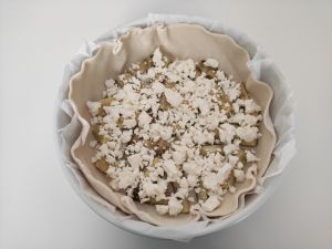 Stendere la pasta sfoglia in una teglia da forno e disporre sul fondo la zucchina tagliata a piccoli pezzi. Aggiungere la feta sbriciolata e infine i piselli.