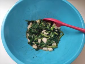Cuocere la bieta in padella con un cucchiaio di olio e un pizzico di sale. Quando è pronta, mescolarla in una ciotola con l’uovo e il formaggio tagliato a cubetti.