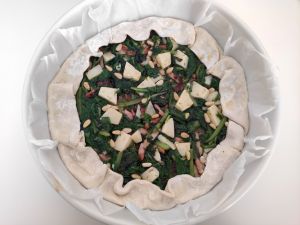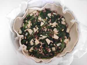 Stendere la pasta sfoglia in una teglia da forno, riempirla con il composto appena preparato e aggiungere in cima un cucchiaio di pinoli.