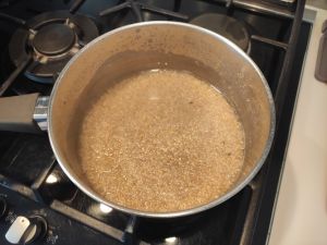 Nel frattempo, portare ad ebollizione 450 g di acqua. Salare e, quando bolle, aggiungere la quinoa. Cuocere per 10 minuti e spegnere la fiamma. Lasciar riposare coperto per 5 minuti.