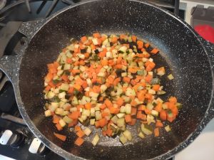 Pulire bene le verdure e tagliarle a piccoli cubetti. In una padella capiente, scaldare un filo di olio e aggiungere le verdure. Salarle, aggiungere le spezie e cuocerle coperte a fiamma media finchè non sono cotte.